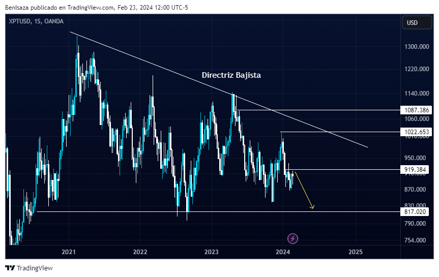 El platino otro de los metales favoritos de este mercado, pero no ha logrado recuperar la barrera de los 920 puntos. De no ser superada esta zona en el corto plazo proyecta una continuidad descendente con objetivo los 817 puntos.