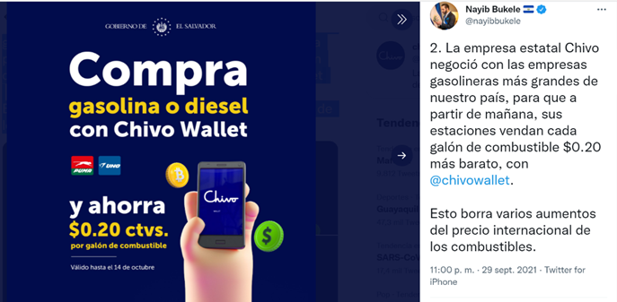 El anuncio, incluye un descuento sustancial en los precios de la gasolina si esta se cancela con Chivo Wallet. Según el presidente Bukele:
