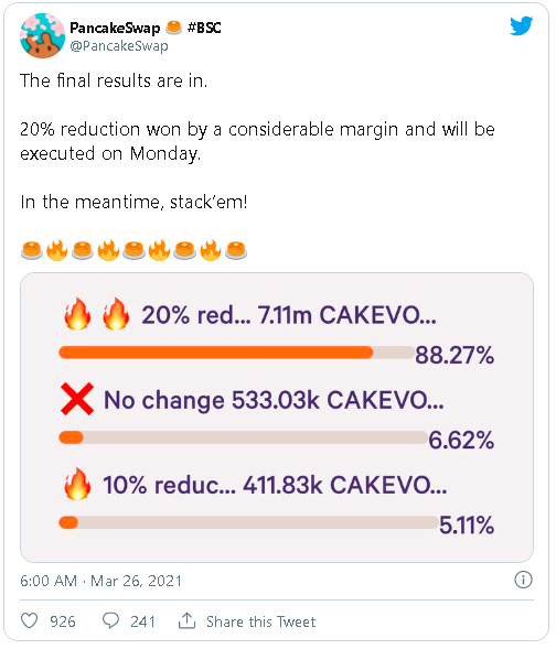 CAKE subió de 11 dólares hasta casi 15 dólares en aproximadamente 24 horas. Posiblemente, su subida esté fundamentada en la decisión de la gobernanza de reducir la emisión de nuevos CAKE en un 20% para su apartado de “Farm”.