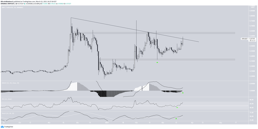 XRP ha ido aumentando desde que alcanzó un mínimo de 0,365 dólares el 23 de febrero. Hasta ahora, ha alcanzado un máximo de $0,591, haciéndolo el 22 de marzo.