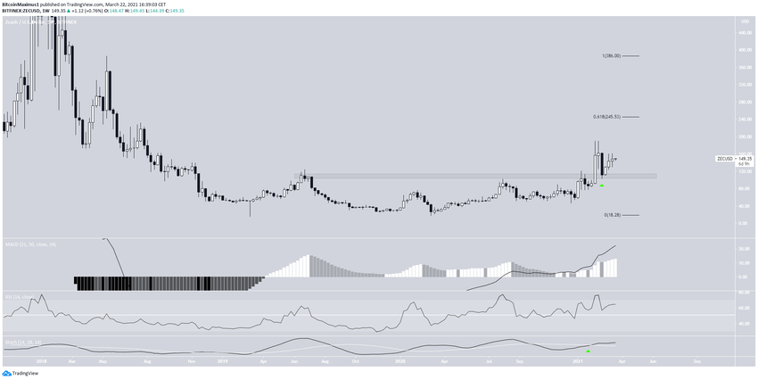 El gráfico semanal muestra que ZEC sigue cotizando por encima de la principal zona de soporte a largo plazo, que se encuentra en 110 dólares.