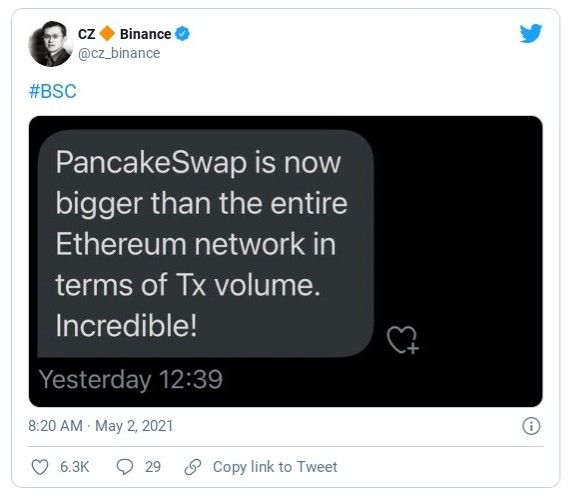 A raíz de la noticia, PancakeSwap basado en Binance Smart Chain ha sido objeto de elogios. El CEO de Binance, Changpeng Zhao, mostró su satisfacción y apoyo al proyecto a través de Twitter.