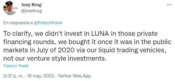 Posteriormente Krug hizo la aclaración a través de Twitter que la inversión en LUNA ocurrió durante el verano de 2020 tras el debut del token en el mercado. Por lo tanto, la inversión de la empresa en LUNA está separada de las inversiones en Terraform Labs.