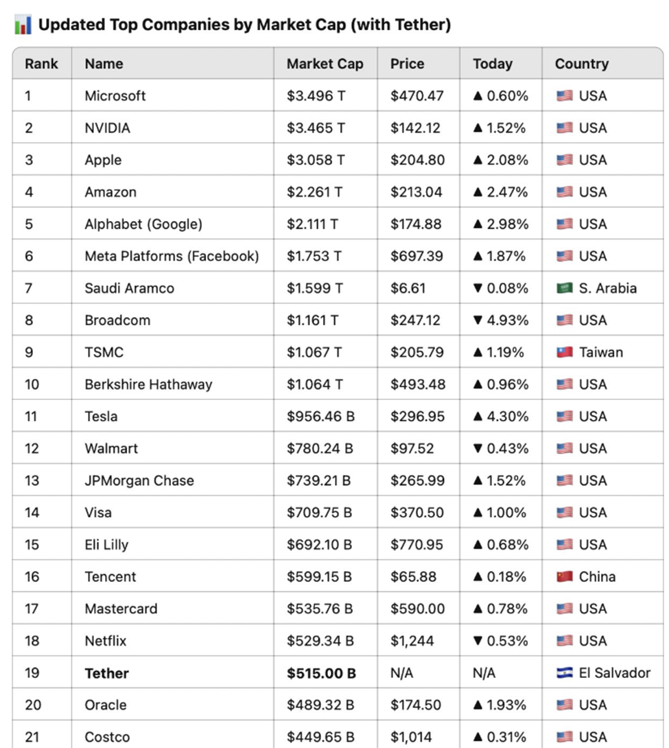 “Si Tether saliera a bolsa HOY, Tether sería la 19ª empresa más grande del mundo con 515 mil millones de dólares. Eso está por delante de Costco y Coca Cola,” escribió Ma.