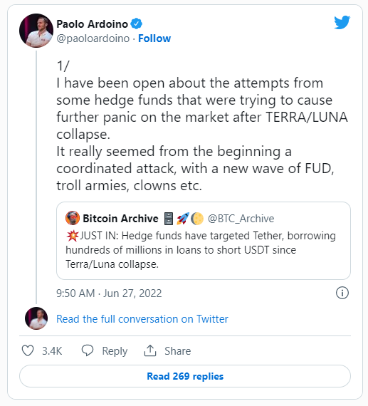 Paolo Ardoino publicó un extenso hilo de Twitter en el que alegaba que los fondos de cobertura estaban haciendo shorting con Tether (USDT) y estaban intentando “causar más pánico en el mercado”.