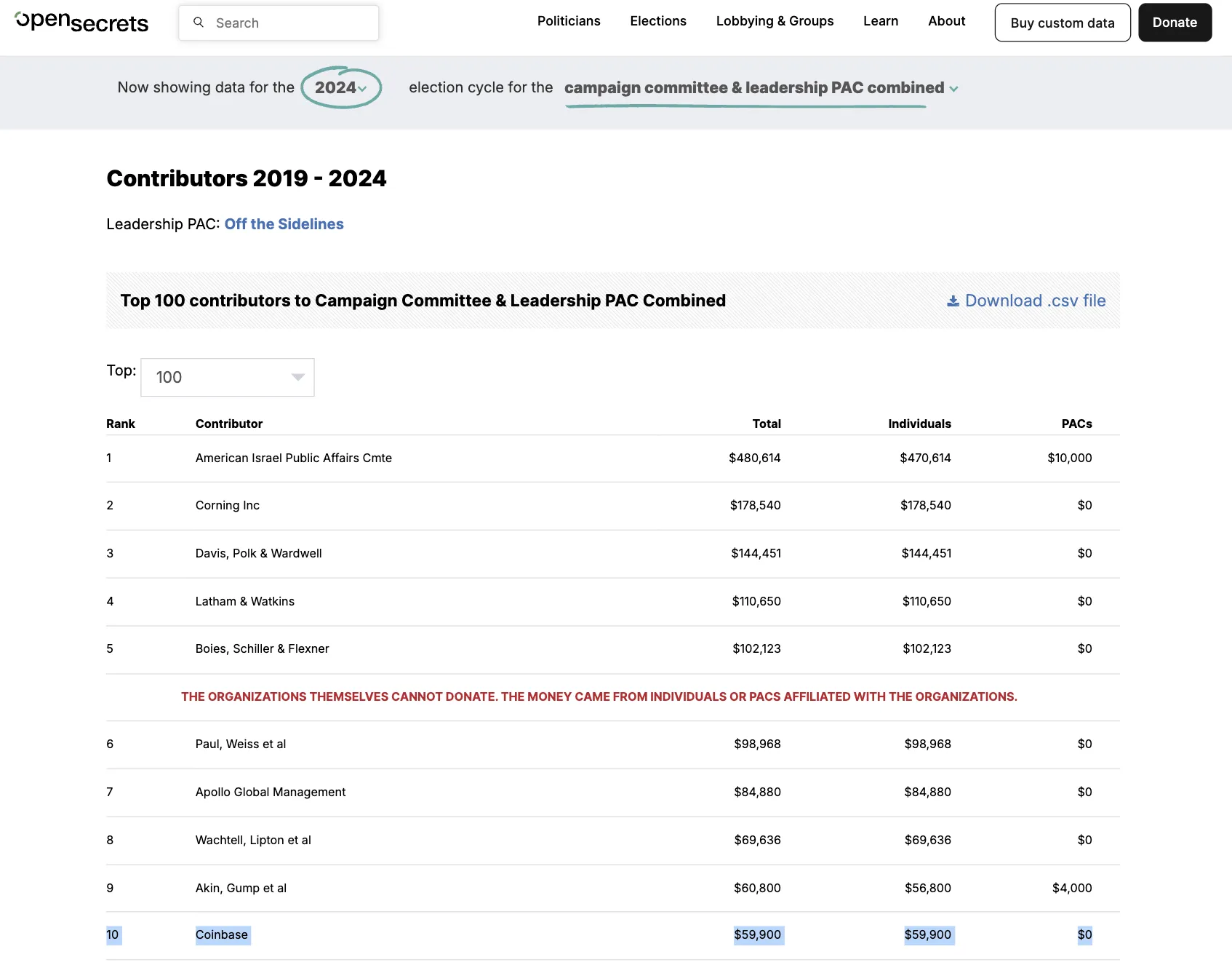 Considerando esta información, en 2024, los contribuyentes asociados con Coinbase fueron los décimos mayores donantes corporativos a Off the Sidelines, el PAC de liderazgo de la senadora Gillibrand. En conjunto, donaron 59,900 dólares a su campaña de reelección.