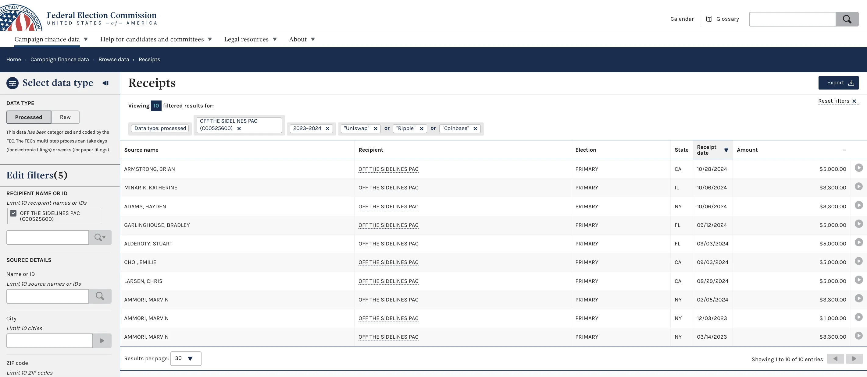 Según los datos recopilados por la FEC, el PAC de liderazgo de Gillibrand recibió 366,043.12 dólares en contribuciones individuales entre 2023 y 2024. Combinando estas contribuciones, BeInCrypto encontró 10 donaciones individuales de figuras prominentes que listaron a Coinbase, Ripple y Uniswap Labs como sus empleadores.