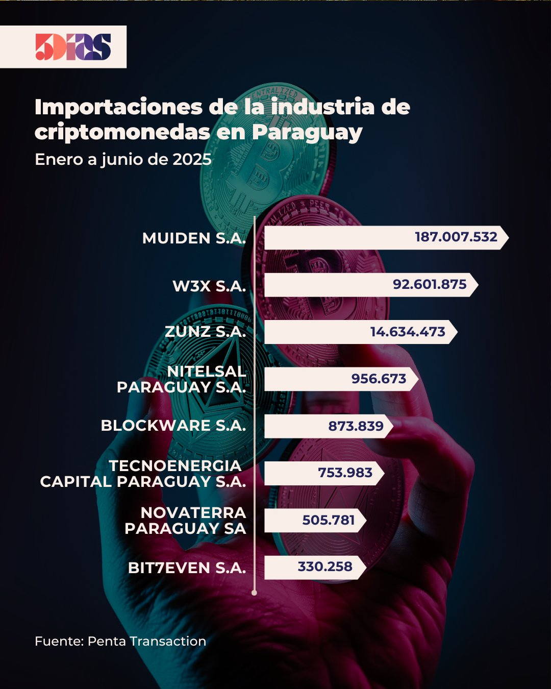En la primera mitad de 2025, las empresas mineras de Bitcoin invirtieron en la importación de equipos especializados para la minería de criptomonedas, lo que resalta el creciente interés en el país, sumado a las ventajas, como el acceso a energía hidroeléctrica barata. Actualmente, Paraguay es atractivo para las empresas de minería debido a su marco regulatorio claro.