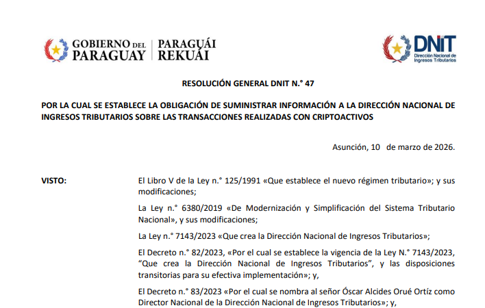 En un movimiento que marca un hito en la regulación de los activos digitales en América Latina, Paraguay ha implementado una nueva normativa fiscal destinada a aumentar la transparencia en el ecosistema de las criptomonedas. La Dirección Nacional de Ingresos Tributarios (DNIT) publicó la Resolución General N.º 47/2026, que obliga a los contribuyentes a reportar detalladamente sus operaciones con criptoactivos al fisco paraguayo.