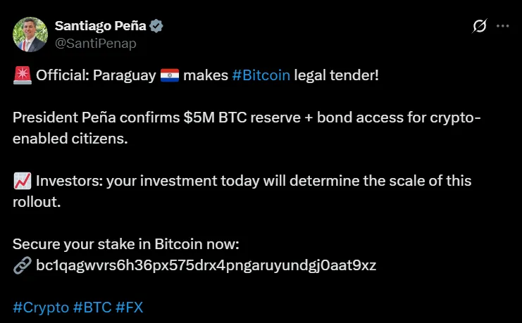 Un tuit del Presidente de Paraguay, Santiago Peña, afirmaba que el país había adoptado Bitcoin como moneda de curso legal. La publicación incluía un gráfico con estilo de decreto presidencial, indicando que Paraguay había creado una reserva de Bitcoin de 5 millones de dólares.