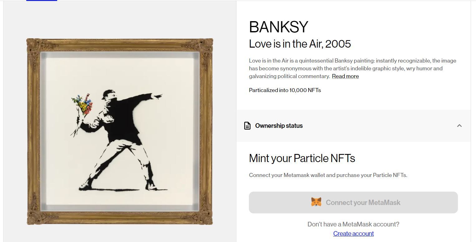 SponsoredEl marketplace “Particle Collection” fue desarrollado con tecnología blockchain de Avalanche (AVAX), y tiene una colección exclusiva del Banksy. En su sitio web detalla que, desde diciembre de 2021, sus NFT están disponibles para quien se sume a su “lista blanca” y conecte su monedero de MetaMask, e incluso promete sus primeros eventos privados en el metaverso para el segundo trimestre del año.