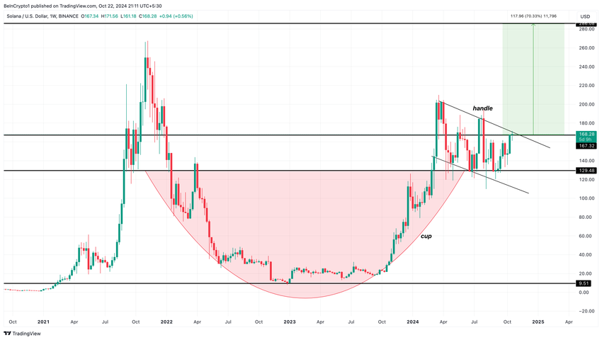 Según el gráfico semanal, SOL ha formado un patrón de taza y asa. Esta cifra aparece cuando el precio experimenta una recuperación en forma de U, parecida a una “taza”, seguida de una fase de consolidación que parece un “asa”.