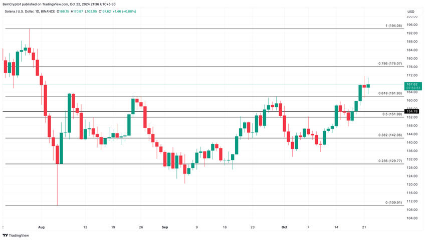 Desde una perspectiva a corto plazo, el precio de Solana ha rebotado por encima del soporte de 155 dólares. Una caída por debajo de este punto podría haber desencadenado una corrección notable para la criptomoneda, pero como no fue así, SOL podría subir.