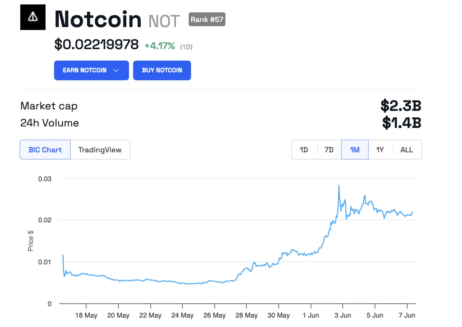 La influencia de estas innovaciones es evidente en el mercado cripto, en particular con Notcoin (NOT). Actualmente se negocia a 0,022 dólares, con una subida del 4,17% en las últimas 24 horas. Aunque el impacto a corto plazo en su precio ha sido mínimo, Notcoin ha escalado hasta el top 60 de criptomonedas por capitalización de mercado.