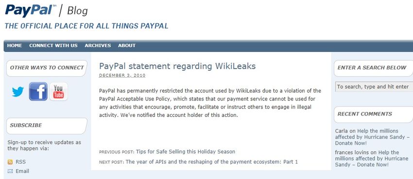 Cuando esto sucedió, PayPal afirmó que la razón era que WikiLeaks estaba violando la Política de Uso Aceptable de PayPal. La política tiene una cláusula que establece que la cuenta no se puede utilizar para actividades que fomenten, promuevan, faciliten o instruyan a otros a participar en actividades ilegales. PayPal no especificó qué actividad ilegal causó la suspensión de su cuenta, pero la decisión se mantuvo.
