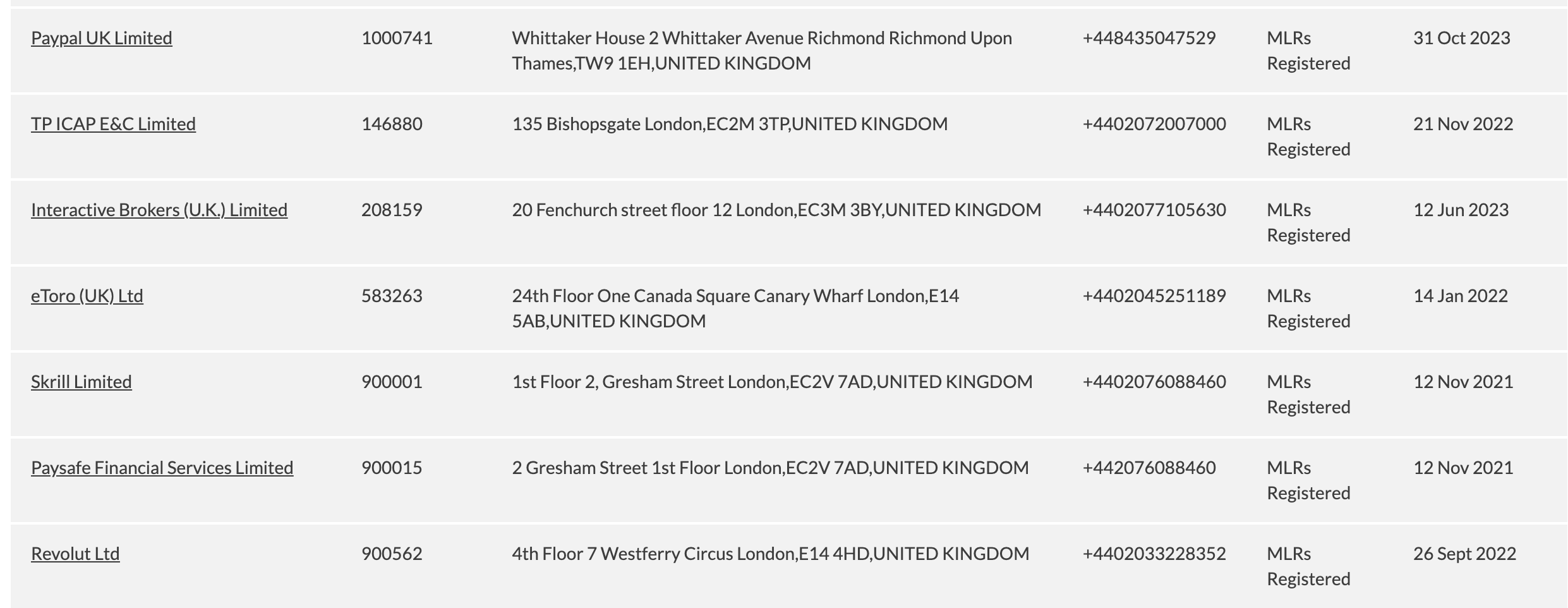 La empresa tiene el número de aprobación 1000741 ante la FCA, quien resaltó que la empresa ya estuvo en el registro previamente, el cual le permite, en caso de cerrar, al cliente reclamar una compensación del Plan de Compensación de Servicios Financieros (FSCS).
