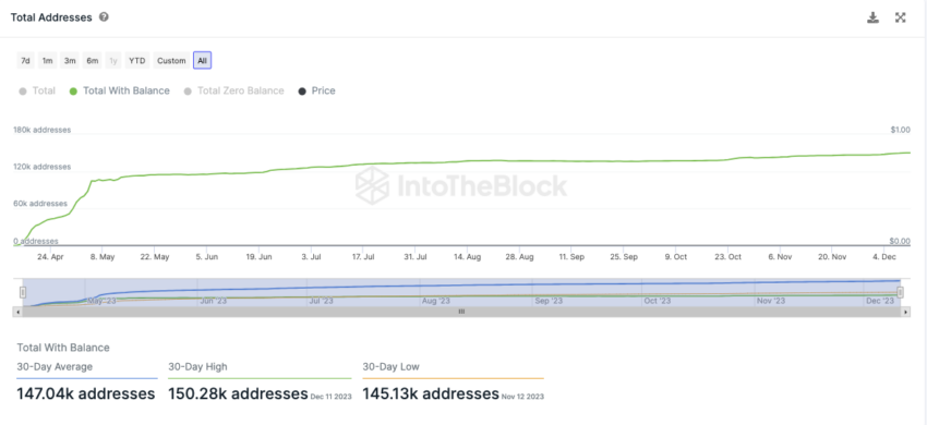 El crecimiento de la red PEPE ha sido lento, como indica la pendiente muy plana de su curva de crecimiento. A pesar de este crecimiento gradual, en los últimos 30 días se han añadido a la red aproximadamente 147,000 direcciones que tienen saldo PEPE.