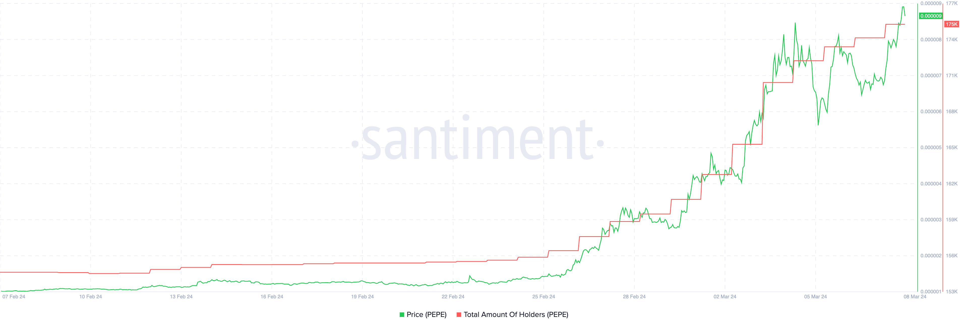 PEPE contaba con unos 150,000 holders el 6 de febrero. El 8 de marzo, su número de holders había aumentado a 175,000. Un token tan grande que acumula un crecimiento del 16% en el número de holders en menos de dos semanas es impresionante.