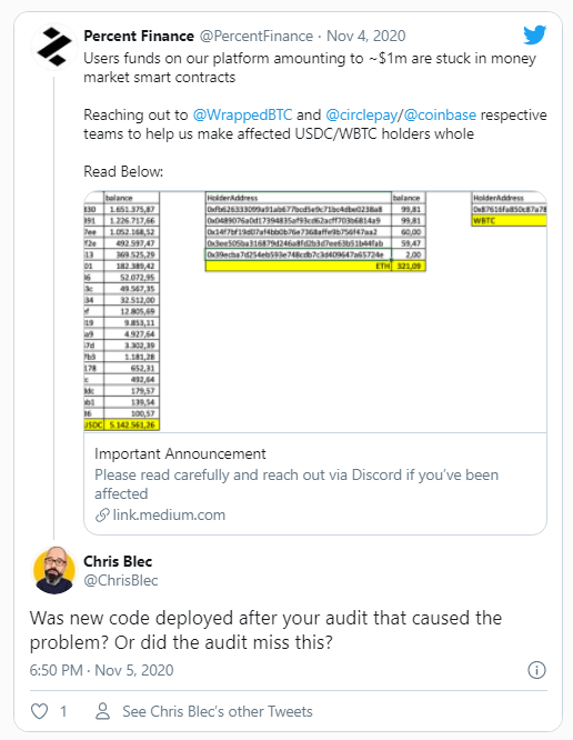 Según una publicación de blog escrita por el equipo de desarrollo detrás del proyecto, algunos de los mercados monetarios de Percent experimentaron un problema que podría significar que los fondos se congelen permanentemente.