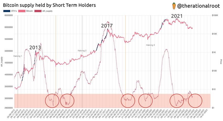 Una caída en el suministro de LTH se correlaciona naturalmente con un aumento en el suministro en manos de STH. Durante un mercado alcista, los holders a largo plazo que compraron BTC a un precio más bajo en el pasado venden sus monedas a compradores a corto plazo. Por el contrario, durante un bear market, los STH capitulan y en su mayoría revenden sus monedas con pérdidas para los LTH. El suministro de Bitcoin vuelve a manos de los holders a largo plazo.