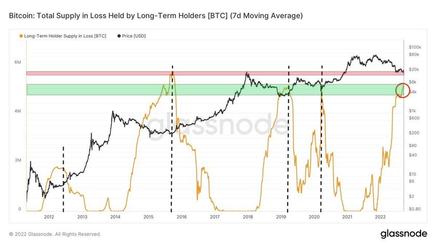En el gráfico a continuación, podemos ver cómo la oferta con pérdidas en manos de los holders a largo plazo está aumentando drásticamente. Actualmente, el gráfico ha alcanzado un área de 5 millones de BTC (círculo rojo). Este es el nivel que sirvió como punto de referencia para la parte inferior absoluta del precio de BTC en 2019 y 2020 (verde).
