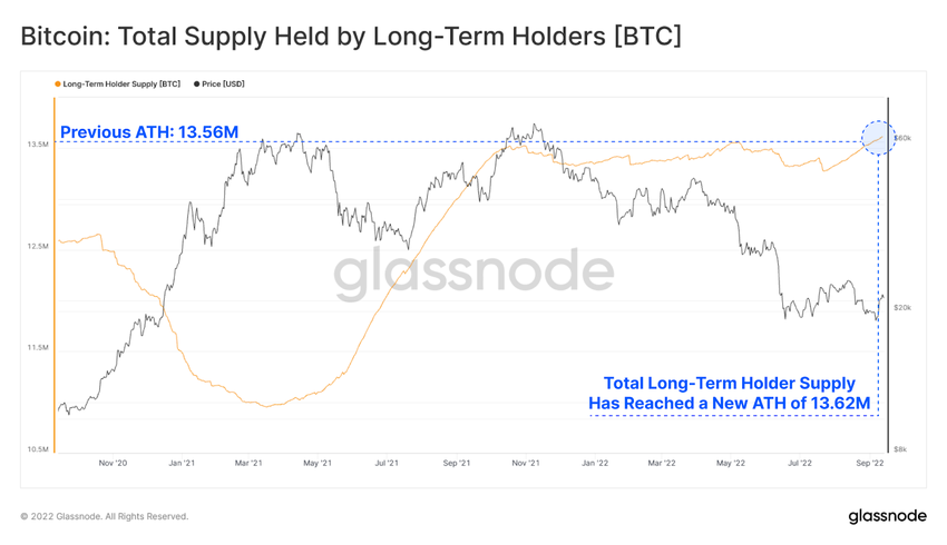 Según datos de Glassnode, actualmente, el suministro total en manos de los holders a largo plazo ha alcanzado el nuevo máximo histórico (ATH) de 13,62 millones de BTC.