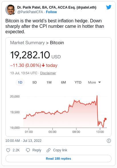 En el momento de la publicación, los precios de Bitcoin se habían recuperado de los efectos posteriores a las noticias sobre la inflación y habían regresado a 20,000 dólares. Sin embargo, la perspectiva macroeconómica a corto plazo sigue siendo muy sombría.