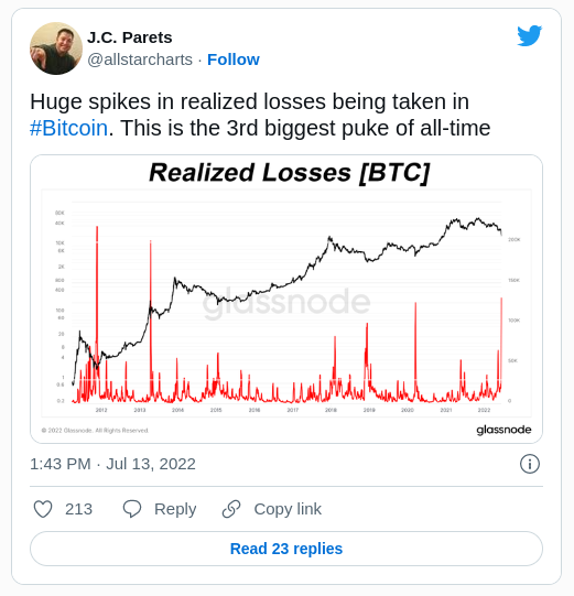 En junio, Glassnode reportó tres días consecutivos con las mayores pérdidas realizadas denominadas en USD en la historia de Bitcoin, con más de 7,3 mil millones de dólares en salidas. El gráfico actualizado se publicó en Twitter el 14 de julio.