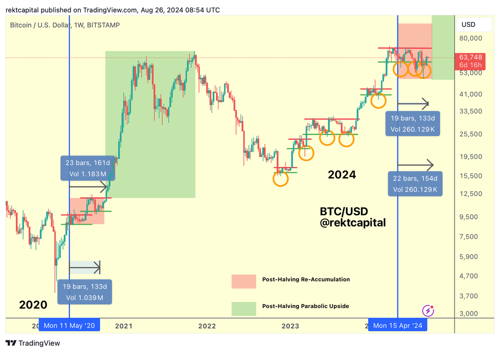 Al mismo tiempo, Rekt Capital sugirió que el proceso actual de reacumulación de Bitcoin no es el más largo de este ciclo. El analista también proyecta que BTC podría alcanzar su máximo histórico en octubre de 2024.