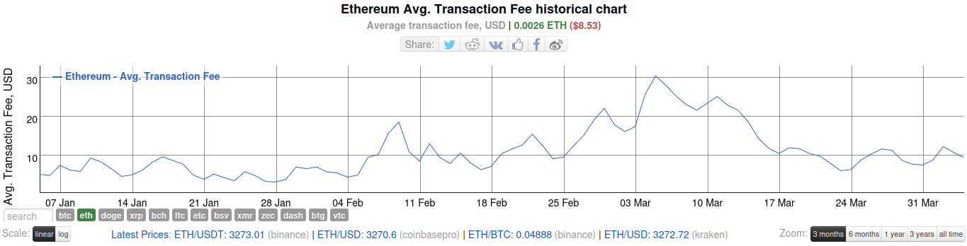 Sponsored SponsoredAl momento de la publicación, la tarifa promedio de transacción de la segunda criptomoneda más grande se ubica en 0.0026 ETH (8.53 dólares), según datos de BitInfoCharts.