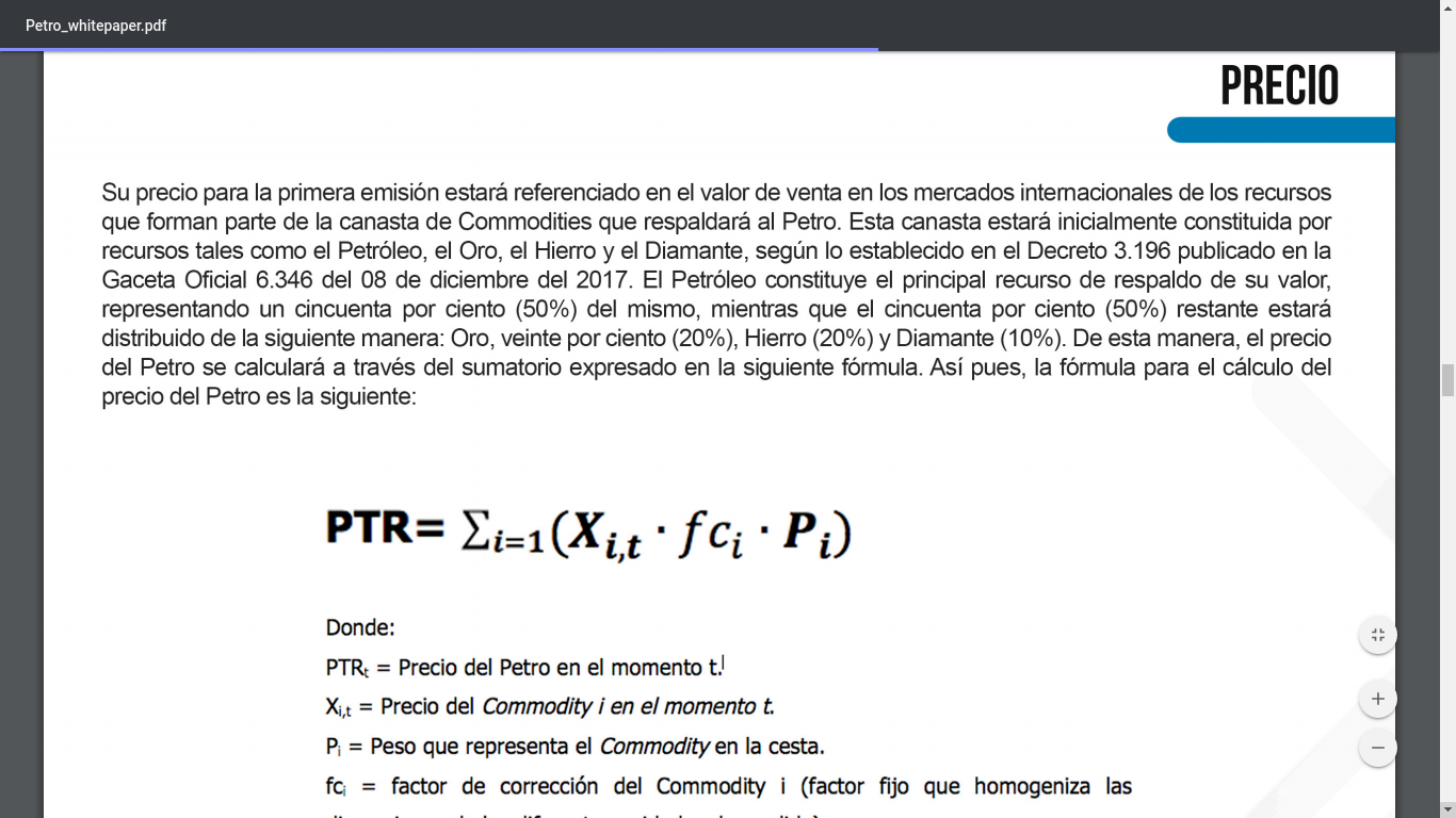 Por su parte, el valor como Stablecoin explica que el precio del Petro se pagaría oficialmente a través de una formula que promedia el valor de una canasta de productos multiplicando su valor por un factor de corrección. Se habló de un precio referencial cercano a los 60$ (1.800.000 Bolívares actuales) para el momento de salida del Petro —valor que muchos tomaron como no-fluctuante, aunque esta característica nunca se mencionó ni en el whitepaper ni en el marco jurídico.