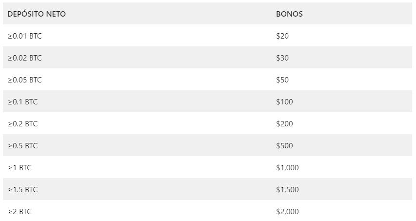 SponsoredPor ejemplo, un depósito mínimo de 0,01 BTC al unirse al evento le generará un bono de 20 $. Para depósitos de al menos 2 BTC, recibirás una recompensa de 2.000 $. ¡Así que sube la apuesta!