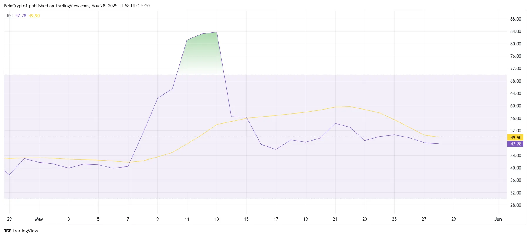 El Índice de Fuerza Relativa (RSI) recientemente cayó por debajo de la línea neutral de 50 después de estar cerca de ella durante varios días. Este movimiento bajista sugiere que el momentum de PI ha cambiado de alcista a bajista, aumentando la probabilidad de presión de venta.