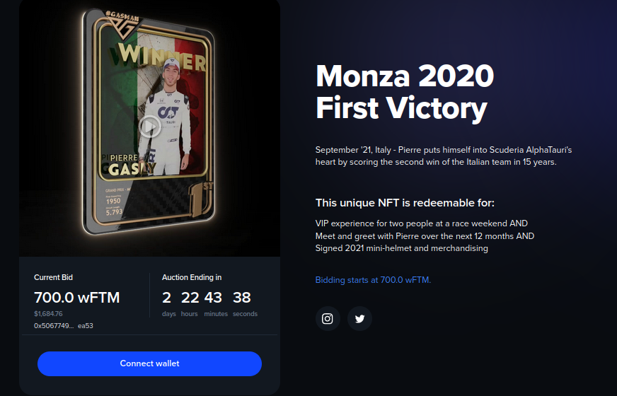 Este NFT único se puede canjear por una experiencia VIP para dos personas en un fin de semana de carrera, conocer y saludar a Pierre y un mini casco junto a merchandising oficial firmado 2021.
