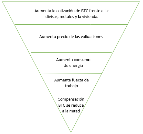 El problema que enfrenta Bitcoin a mediano y largo plazo, es precisamente el costo y el tiempo de las transacciones. A medida que aumenta la fuerza de trabajo en cada halving, aumenta también el consumo de energía. Al haber una disminución de la circulación de Bitcoin aumenta el costo de transacción.
