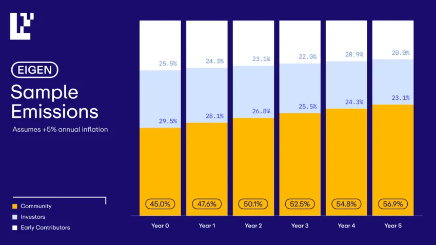 El equipo introdujo el token nativo, por un total de 1,670 millones, para mejorar el ecosistema EigenLayer. La Fundación Eigen, una organización independiente sin fines de lucro, asignó el 45% de estos tokens a actividades relacionadas con la comunidad. Estos incluyen staking, iniciativas comunitarias y desarrollo de ecosistemas.