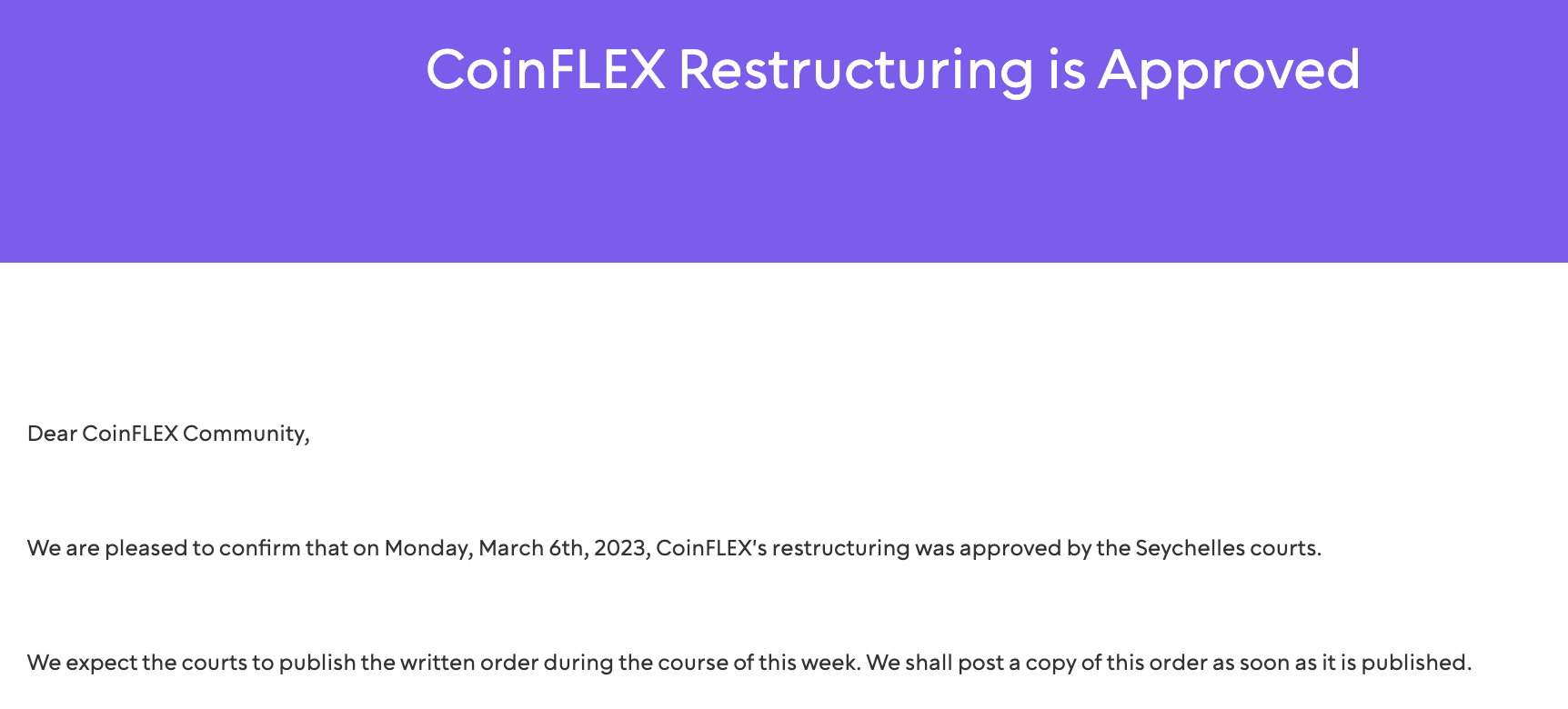 “Nos complace confirmar que el lunes 6 de marzo de 2023, los tribunales de Seychelles aprobaron la reestructuración de CoinFLEX. Esperamos que los tribunales publiquen la orden escrita durante el transcurso de esta semana. Publicaremos una copia de esta orden tan pronto como se publique. Se detuvo el trading de activos bloqueados (LUSD, LETH, etc.)”.