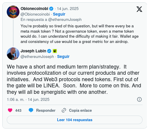 Sus comentarios surgieron durante una actualización reciente en X, donde respondió a preguntas sobre los planes de tokens para los diversos productos de Consensys.