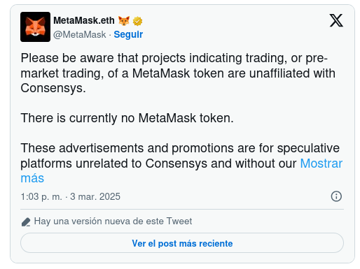 En los últimos meses, la especulación sobre un token de MetaMask ha sido persistente, a pesar de múltiples advertencias del equipo. En marzo, MetaMask emitió un aviso para alertar a los usuarios sobre estafas que involucraban promociones de tokens falsos.