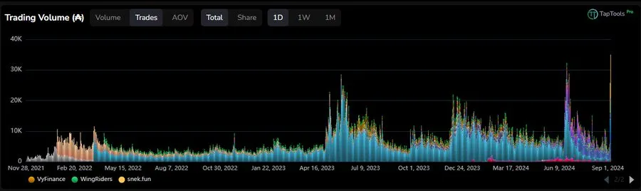 El 6 de septiembre, Snek anunció que Cardano había alcanzado un volumen de transacciones diarias récord. Esto marcó la actividad de trading DEX de 24 horas más alta en la historia de la blockchain, señalando un gran aumento en el compromiso de la red.
