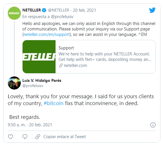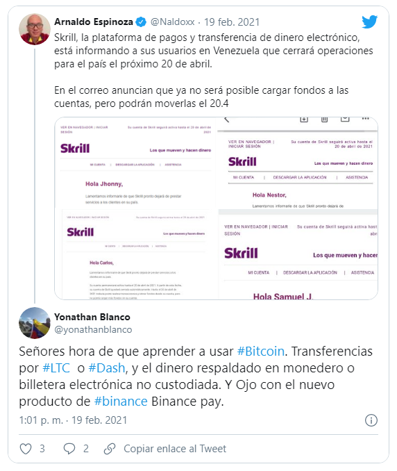 Otro elemento que fue notorio en redes sociales es que mientras muchos se lamentaban por la decisión de Skrill y Neteller sobre los usuarios venezolanos, otros aprovechaban para aclarar que las criptomonedas podían ayudar a las personas afectadas.
