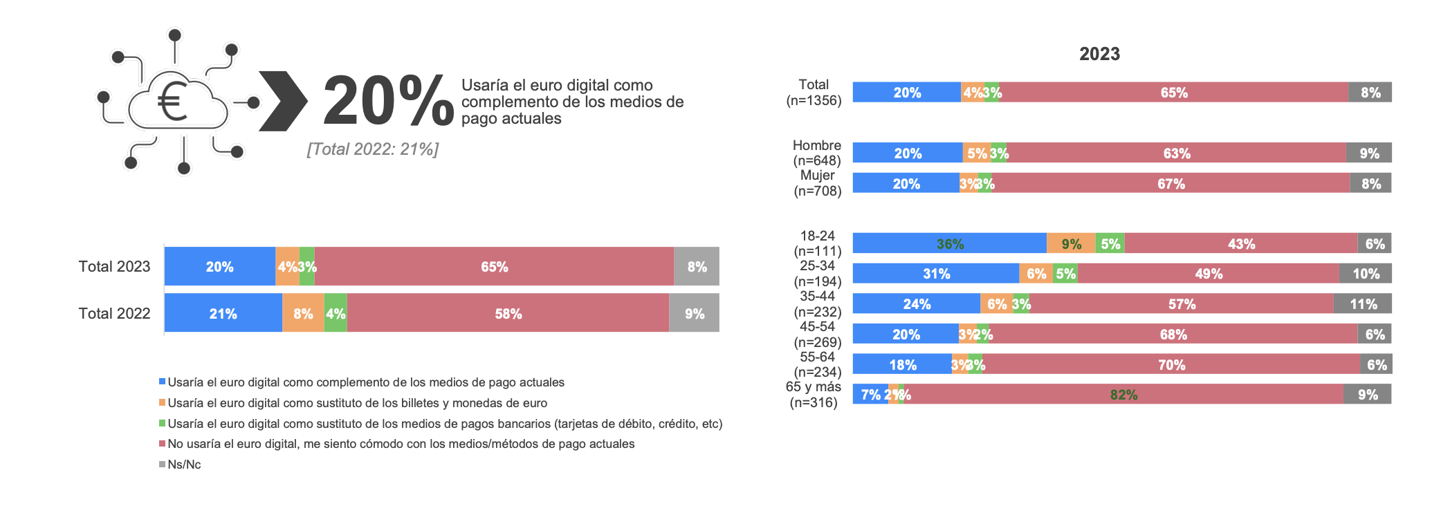 Los españoles de entre 18 y 24 años son los más entusiastas por utilizar el euro digital, con un 36% y el interés disminuye con la edad. De 25 a 44 años, solo el 24% de españoles utilizará el euro digital. En tanto, los adultos de 55 a 64 años, solo el 7% utilizará el euro digital, la CBDC europea.