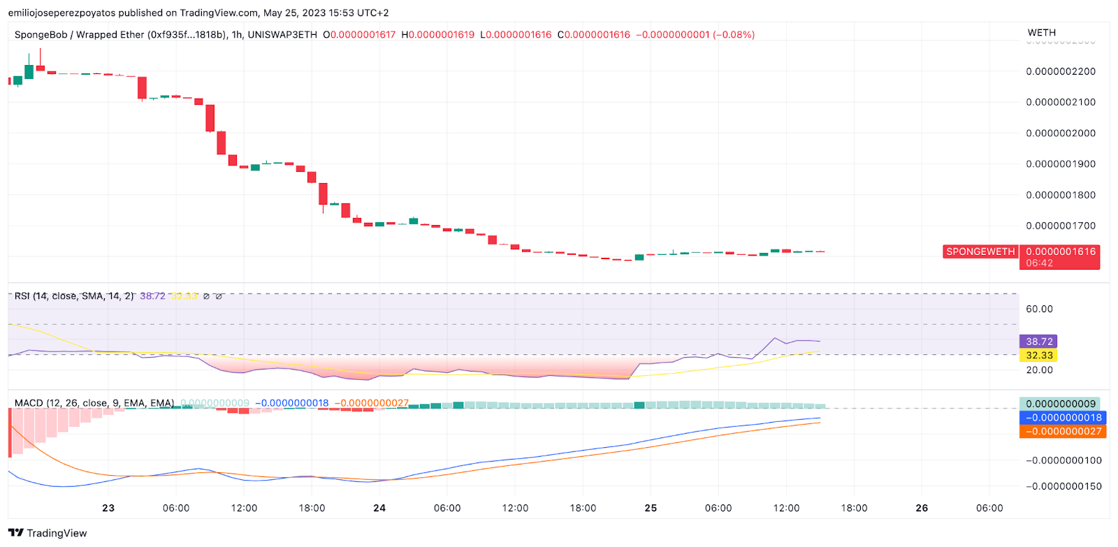 Por último, vamos a establecer la posible pauta de crecimiento empleando para ello la extensión de Fibonacci. Con dicho indicador vemos que el próximo nivel a batir de SPONGE se sitúa en los 0.00000055 ETH. coincidiendo además con el registro alcanzado el pasado 9 y 10 de Mayo. Rota esta barrera, podemos irnos directamente hasta niveles en la órbita de 0.00000055 ETH siempre que las condiciones de mercado nos acompañen.