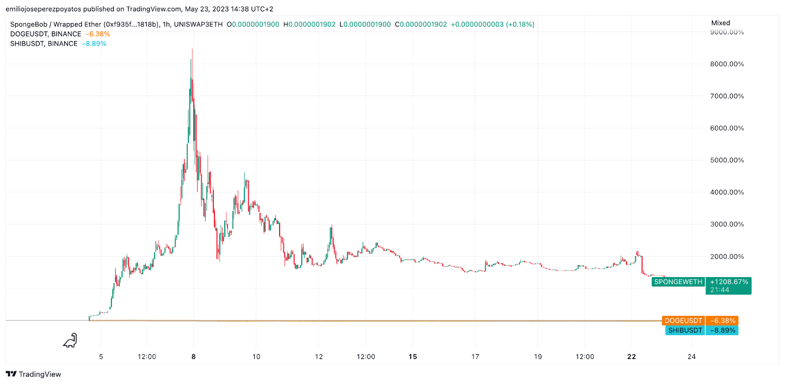 En la actualidad vemos que SPONGE cuenta con una revalorización acumulada desde lanzamiento de un +1.208%. Si efectuamos la comparativa en el mismo periodo podremos comprobar que DOGE ha sufrido pérdidas por valor de -6,38% y SHIB ha retrocedido un -8,89%.