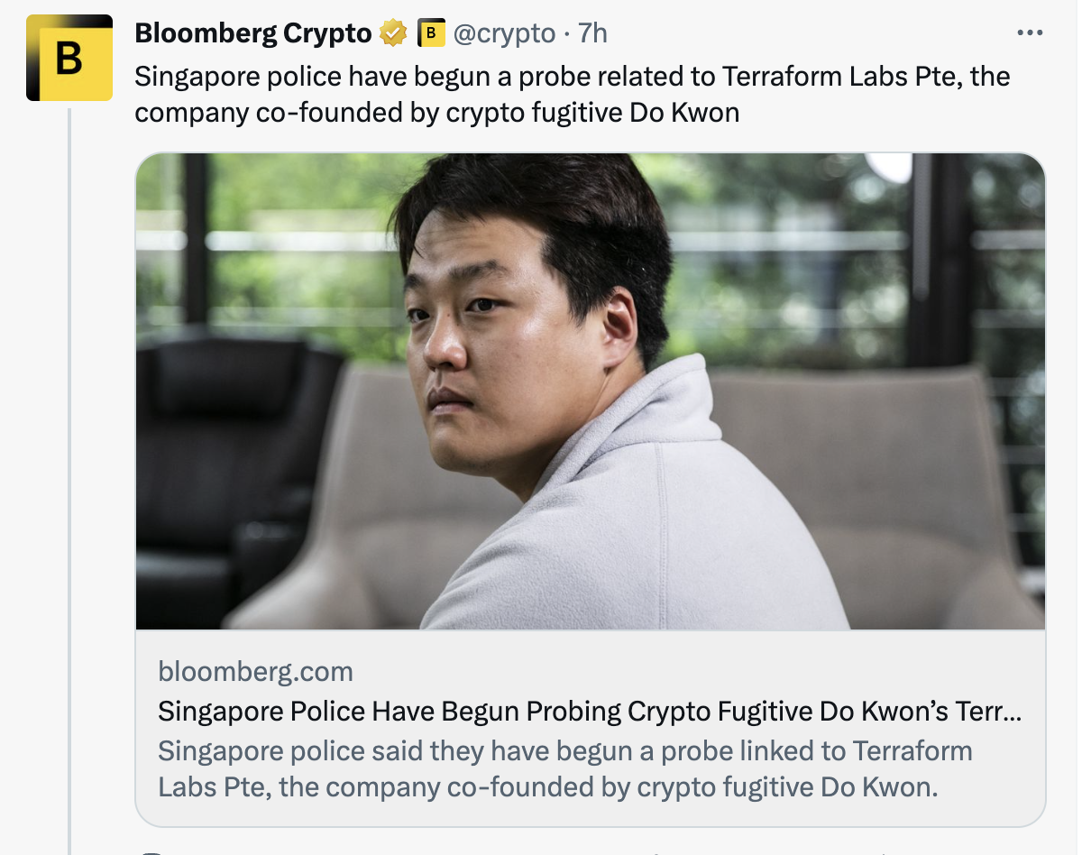 Los problemas del fugitivo Do Kwon se profundizan cuando la policía de Singapur inició una investigación contra su empresa Terraform Labs. La policía le dijo a Bloomberg que las investigaciones están en curso y que “han comenzado investigaciones en relación con Terraform Labs”.