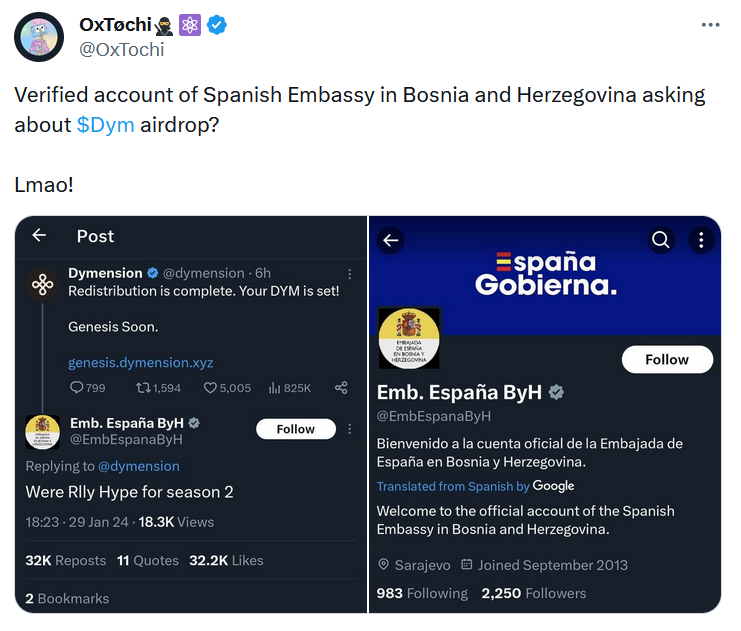 A partir del 30 de enero aparecieron varios tweets en el perfil de la embajada de España, que eran respuestas a publicaciones sobre próximas distribuciones de tokens. Los políticos estaban más interesados en los airdrops de WEN, Júpiter y Dymension.