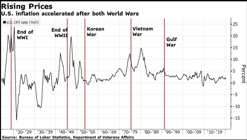 Las políticas actuales imitan la respuesta gubernamental en tiempos de guerra. Ir a guerra requiere un gasto dramático por parte de los gobiernos nacionales y abre las puertas a una inflación galopante.