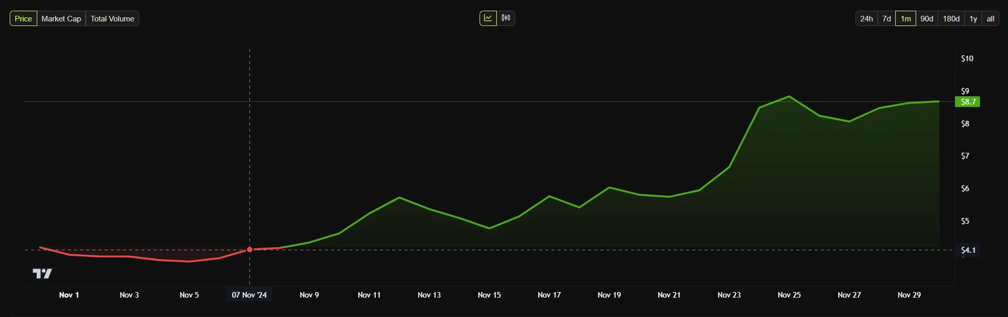 Estas mejoras en Polkadot 2.0 podrían potencialmente reducir las barreras de entrada para los desarrolladores. DOT ha visto un rally significativo en noviembre, aumentando más del 100%. Los altos rendimientos de staking de la red han atraído nuevos usuarios en 2024.