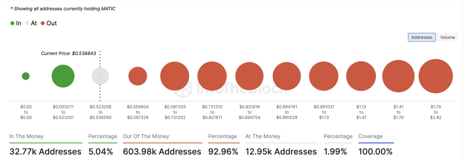 Las ballenas de MATIC no están incentivadas a mantener la altcoin porque muchos tenedores continúan enfrentando pérdidas no realizadas. Al momento de escribir, 604,000 direcciones, que representan el 93% de todos los tenedores de MATIC, están “fuera del dinero”.
