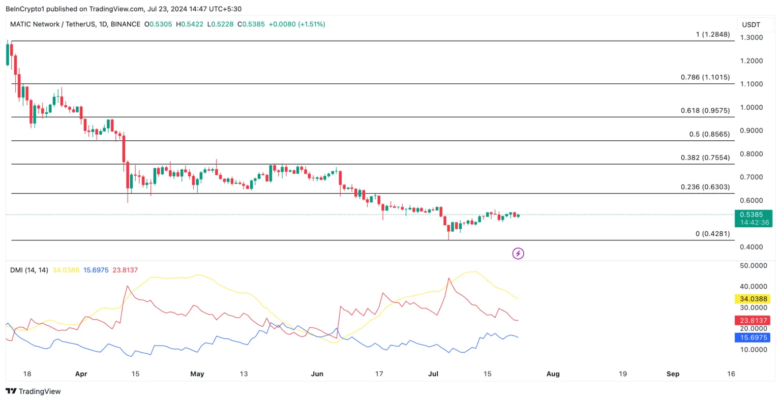 La configuración del Índice de Movimiento Direccional (DMI) de MATIC confirma la tendencia bajista hacia la altcoin y sugiere una mayor caída si la tendencia actual persiste. Al momento de redactar, el indicador direccional negativo (-DI) de la moneda está por encima de su indicador direccional positivo (+DI).